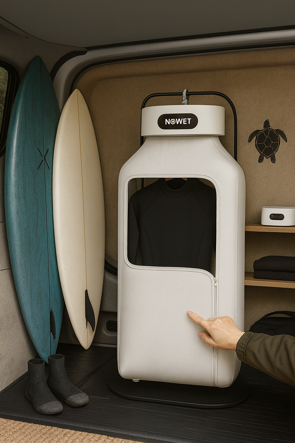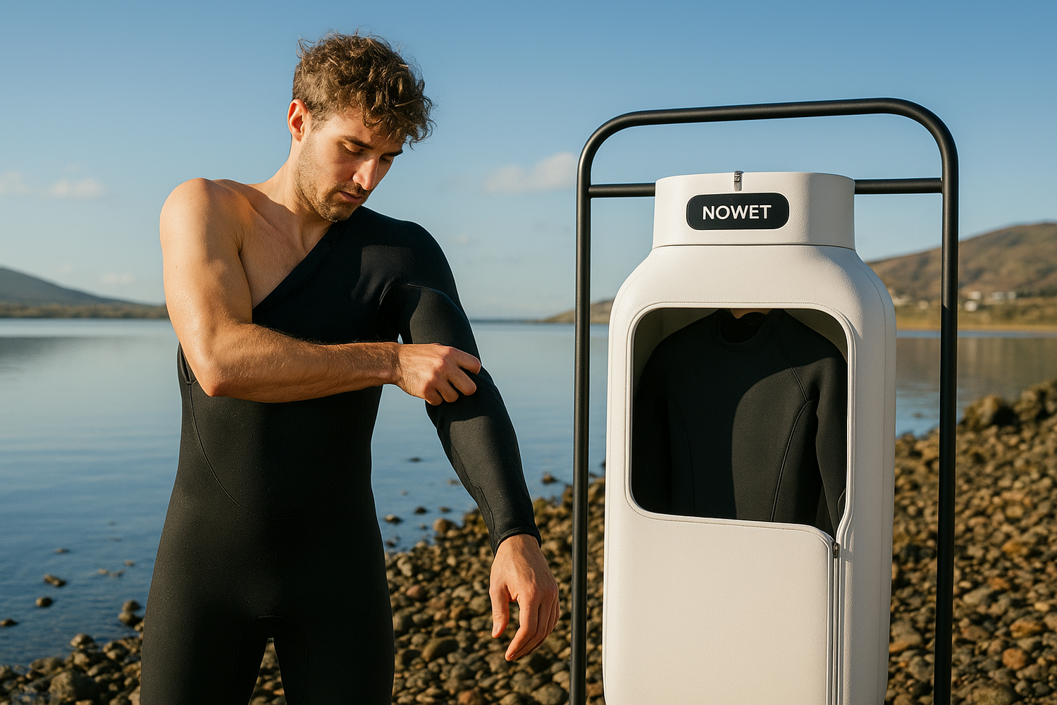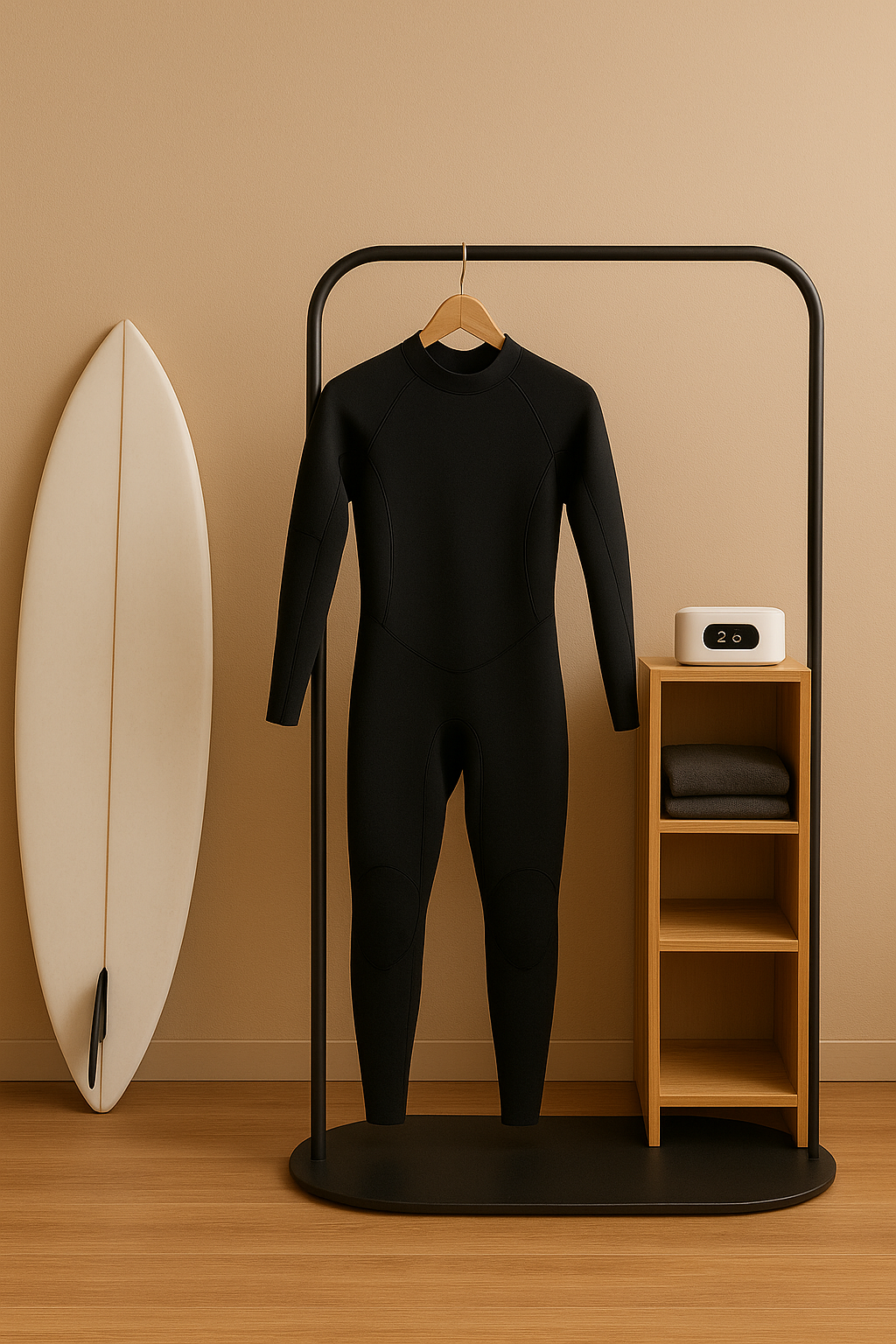 Surfear con ganas empieza antes de tocar el mar. Con este secador, empieza con el neopreno seco.